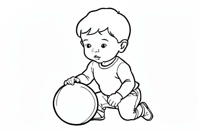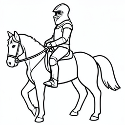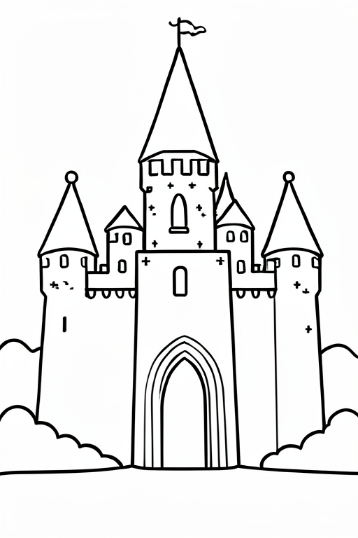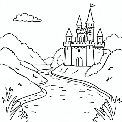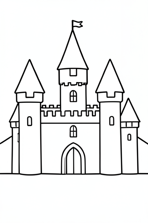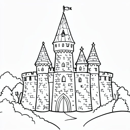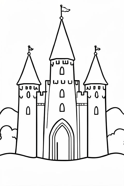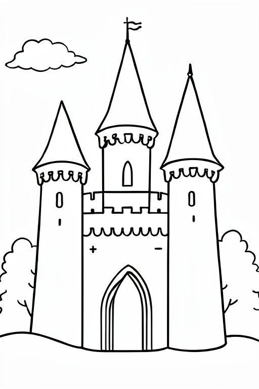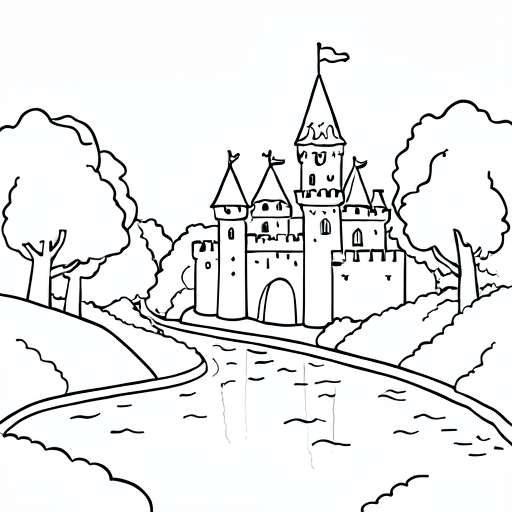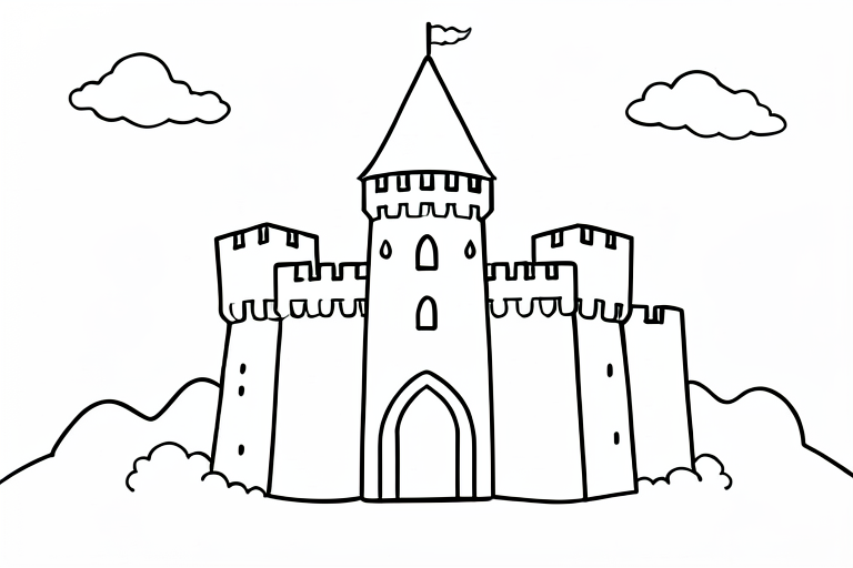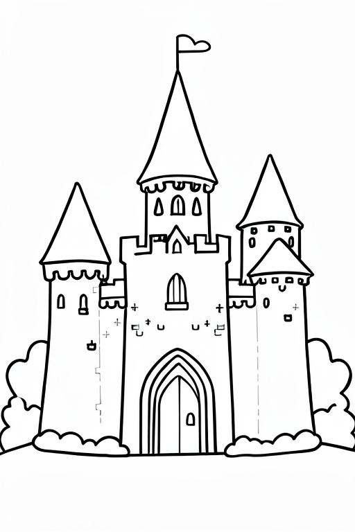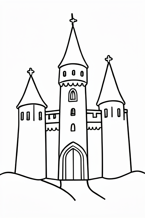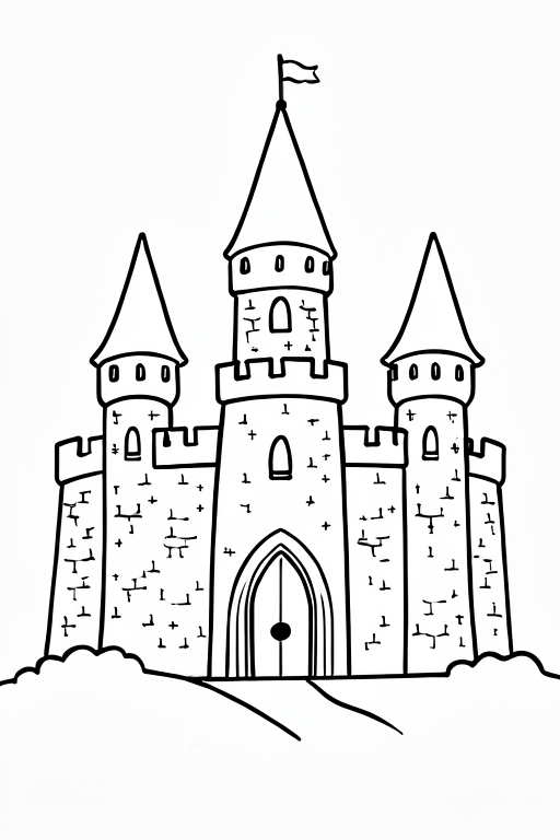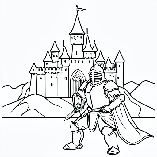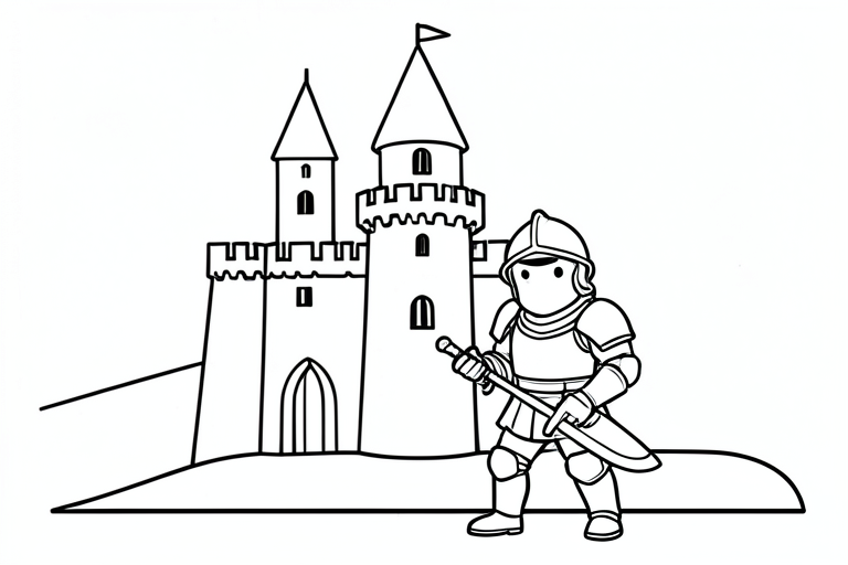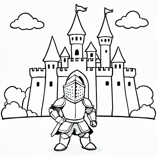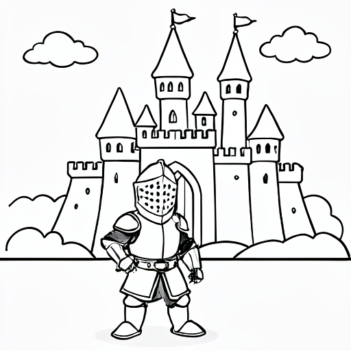 a knight in front of a castle, cartoony, simple black and white line art for children