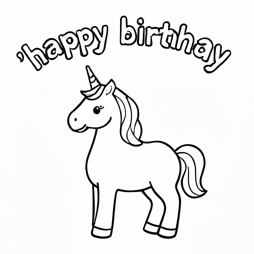 cute cartoony unicorn, and l"happy birthday" above it