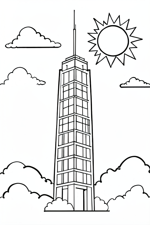 a modern tower with clouds and Sun